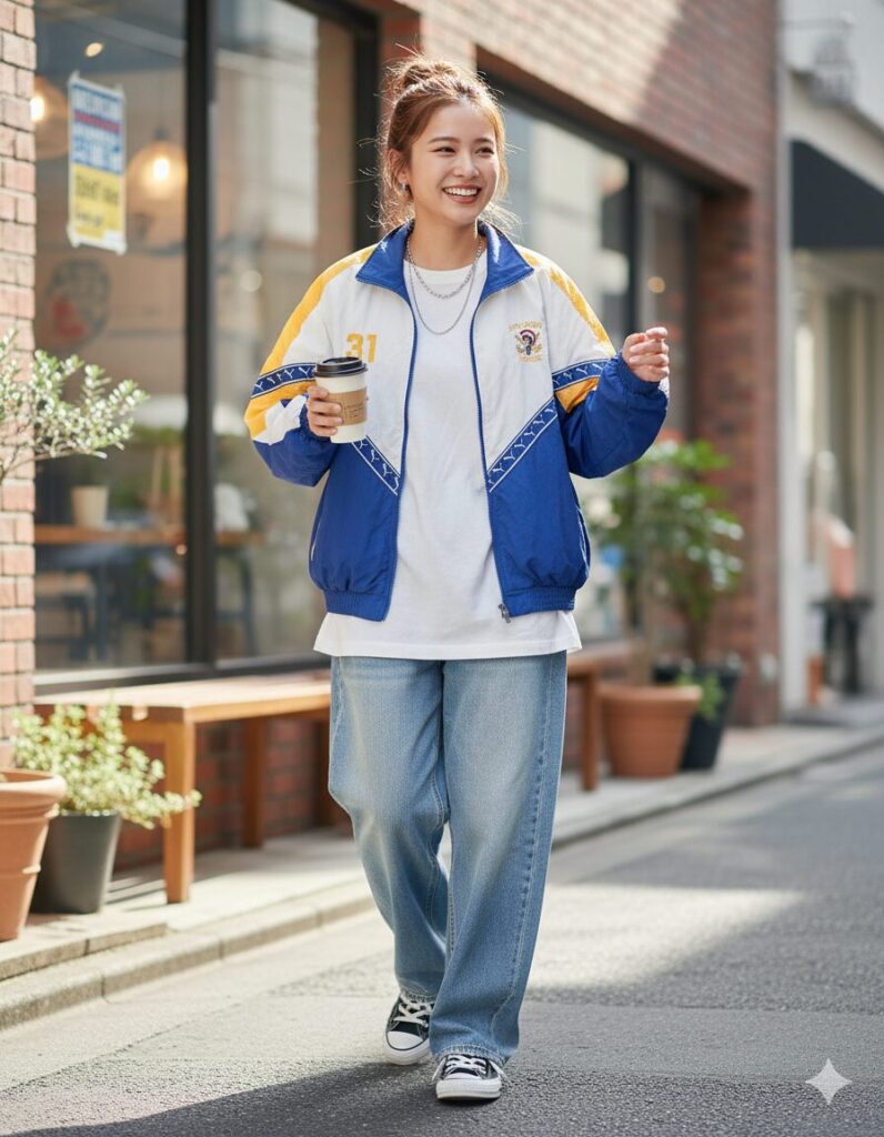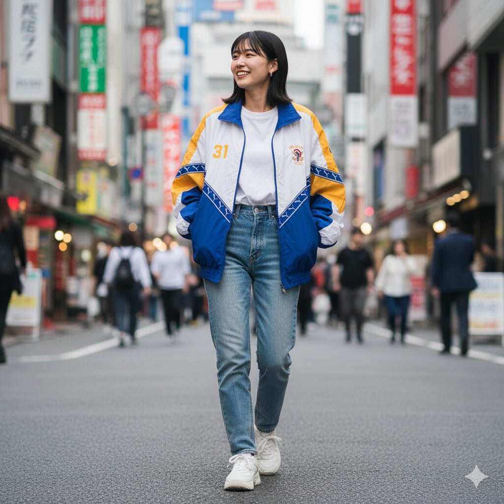 【写真のナイロンジャケットを水色の服を着ている女の子に着せてください。 21歳の古着好きな女の子が、都会を楽しそうに歩いている写真を作成してください。 ナイロンジャケットの広告写真希望。途中まで閉めて、服のサイズが少し大きまな感じで着ている写真に仕上げてください。】