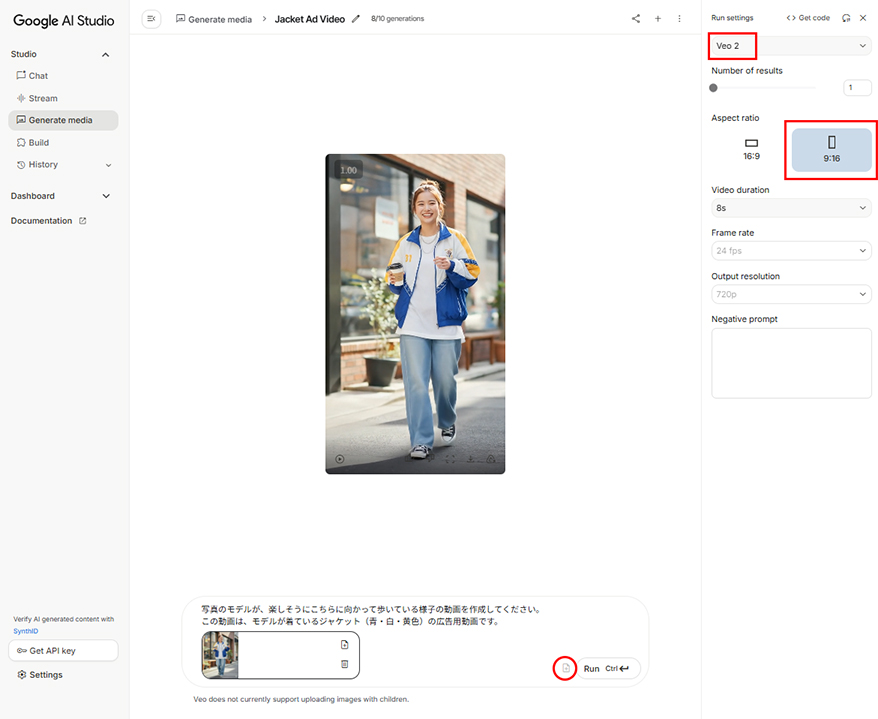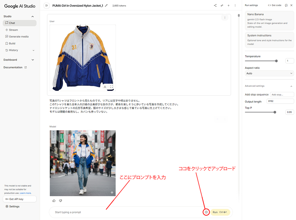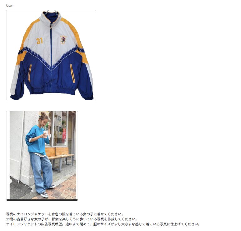 Google AI Studioを使って、可愛いモデルの着画とモデルが商品のナイロンジャケットを着て歩いている動画を制作します。